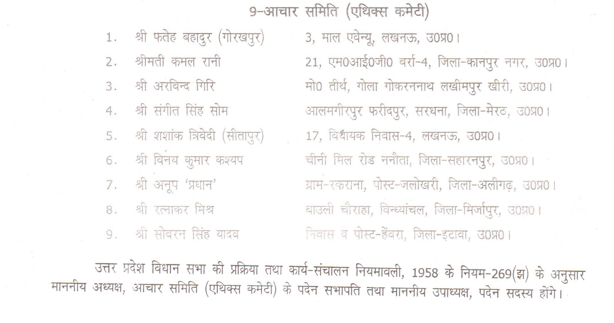 नियम 269-झ-समिति का गठन-उत्तर प्रदेश विधान सभा के सदस्यों के सदन के भीतर तथा सदन के बाहर विधायक के रूप में किये गये आचरण की जांच हेतु अध्यक्ष द्वारा नाम-निर्देशित एक संसदीय "आचार समिति" होगी जिसमें अध्यक्ष तथा उपाध्यक्ष को सम्मिलित करते हुए कुल ११ से अनधिक सदस्य होंगे। अध्यक्ष इस समिति के पदेन सभापति होंगे।