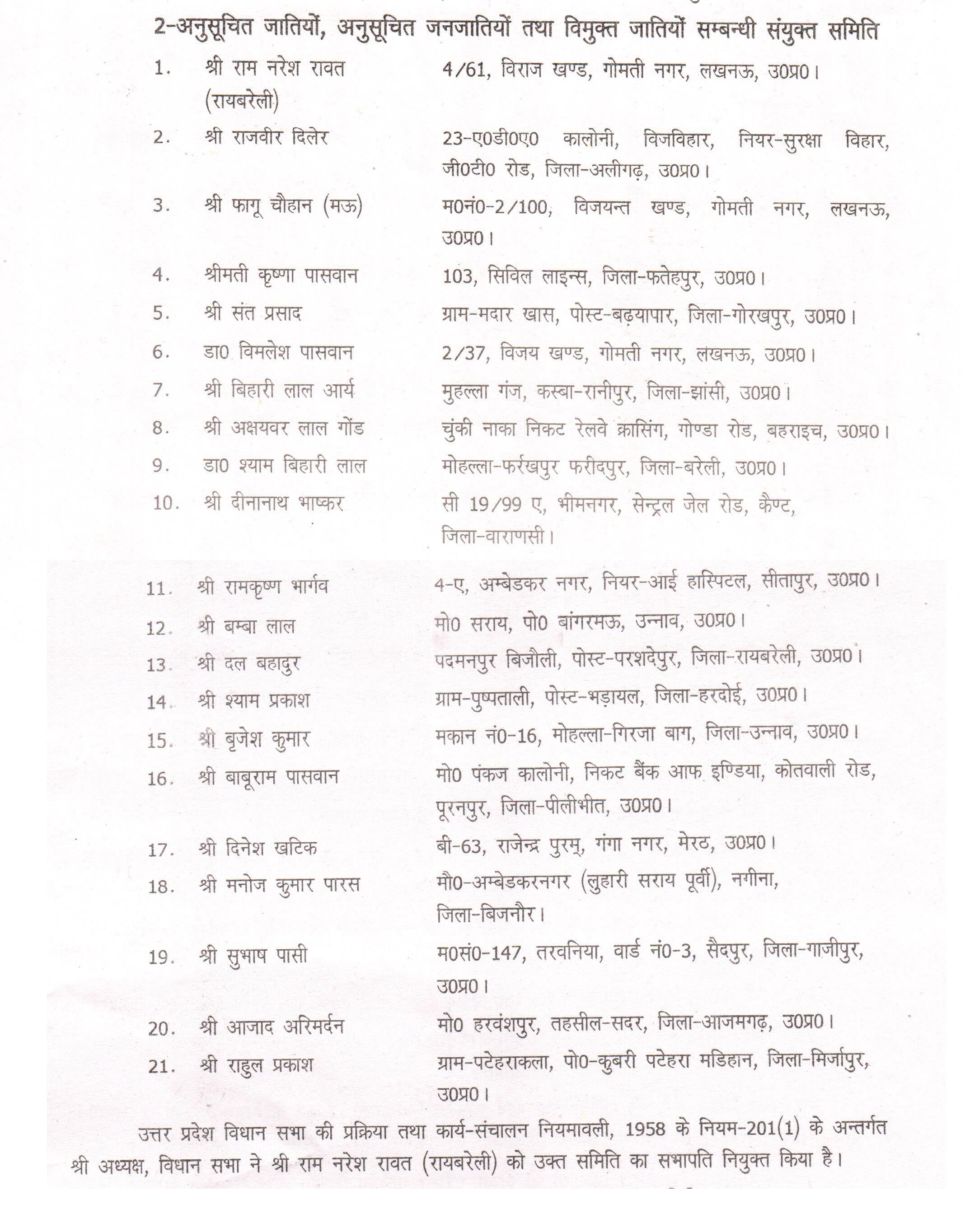 नियम 269-ग-समिति का गठन-राज्य विधान मण्डल के दोनों सदनों की एक संयुक्त समिति गठित की जायेगी, जो "अनुसूचित जातियों, अनुसूचित जनजातियों तथा विमुक्त जातियों सम्बन्धी संयुक्त समिति" कहलायेगी और उसमें २५ सदस्य होंगे जिनमें से २१ सदस्य, विधान सभा के तथा ४ सदस्य विधान परिषद् के होंगे। यह सदस्य प्रत्येक सदन के सदस्यों में से एकल संक्रमणीय मत (सिंगिल ट्रान्सफरेबिल वोट) द्वारा अनुपाती प्रतिनिधित्व के सिद्धान्त के अनुसार निर्वाचित होंगे।