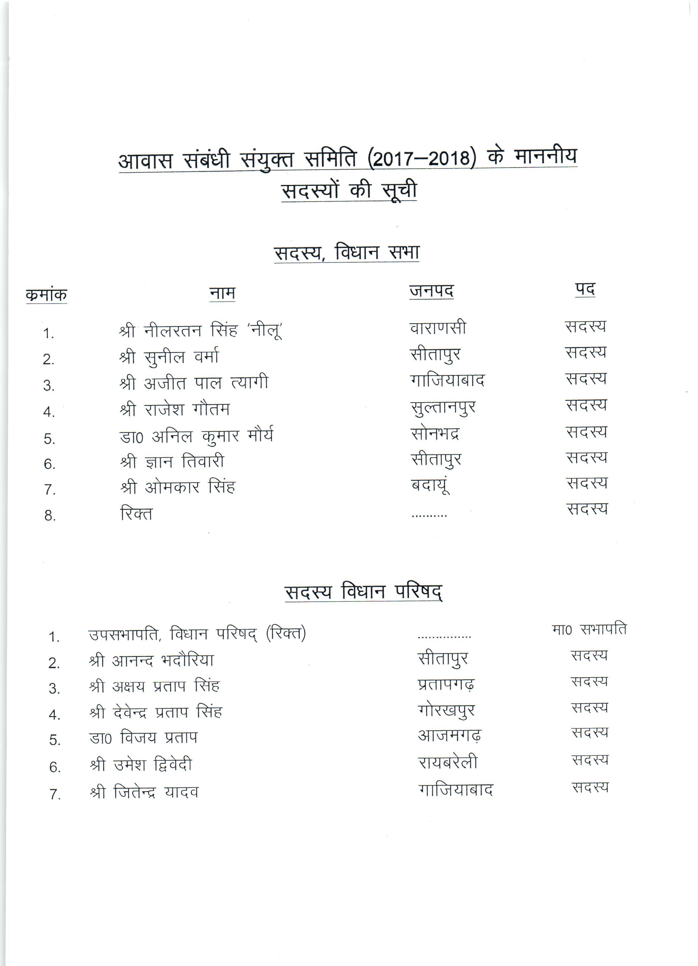 96-(1) उत्तर प्रदेश विधान परिषद् द्वारा दिनांक 29 अगस्त, 1985 को तथा उत्तर प्रदेश विधान सभा द्वारा दिनांक 5 सितम्बर, 1985 को पारित किये गये संकल्प के अनुसार उत्तर प्रदेश विधान मण्डल के सदस्यों तथा विधान मण्डल सचिवालय के अधिकारियों एवं कर्मचारियों के आवास आदि के विषयों पर विचार-विमर्श हेतु “आवास सम्बन्धी संयुक्त समिति’’ होगी।
