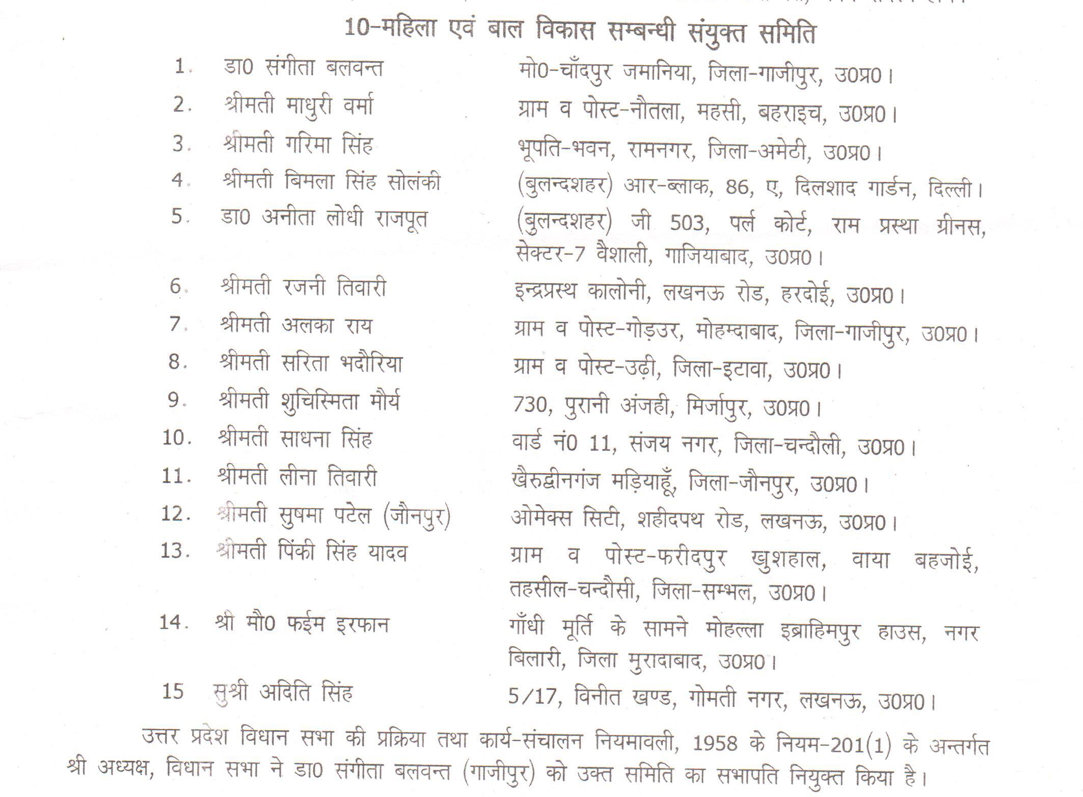 नियम २६९-(ठ) समिति का गठन-राज्य विधान मण्डल के दोनों सदनों की एक संयुक्त समिति गठित की जायेगी, जो ’’महिला एवं बाल विकास सम्बन्धी संयुक्त समिति’’ कहलायेगी। समिति में सभापति को सम्मिलित करते हुए 19 सदस्य होंगे जिनमें 15 सदस्य विधान सभा के तथा 4 सदस्य विधान परिषद् के होंगे। विधान सभा के 15 सदस्य अध्यक्ष, विधान सभा द्वारा तथा विधान परिषद् के 4 सदस्य सभापति, विधान परिषद् द्वारा नामनिर्देशित किये जायेंगे: